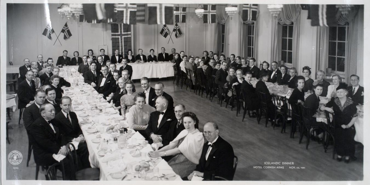 Hópur Íslendinga búsettur í New York saman í kvöldverði. Neðst á myndina er skrifað: ICELANDIC DINNER HOTEL CORNISH ARMS NOV. 29,1941. Á myndinni má þekkja Agnar Klemens Jónsson yst við háborð, og þriðja frá honum Thor Thors og þriðja frá honum Vilhjálm Stefánsson.