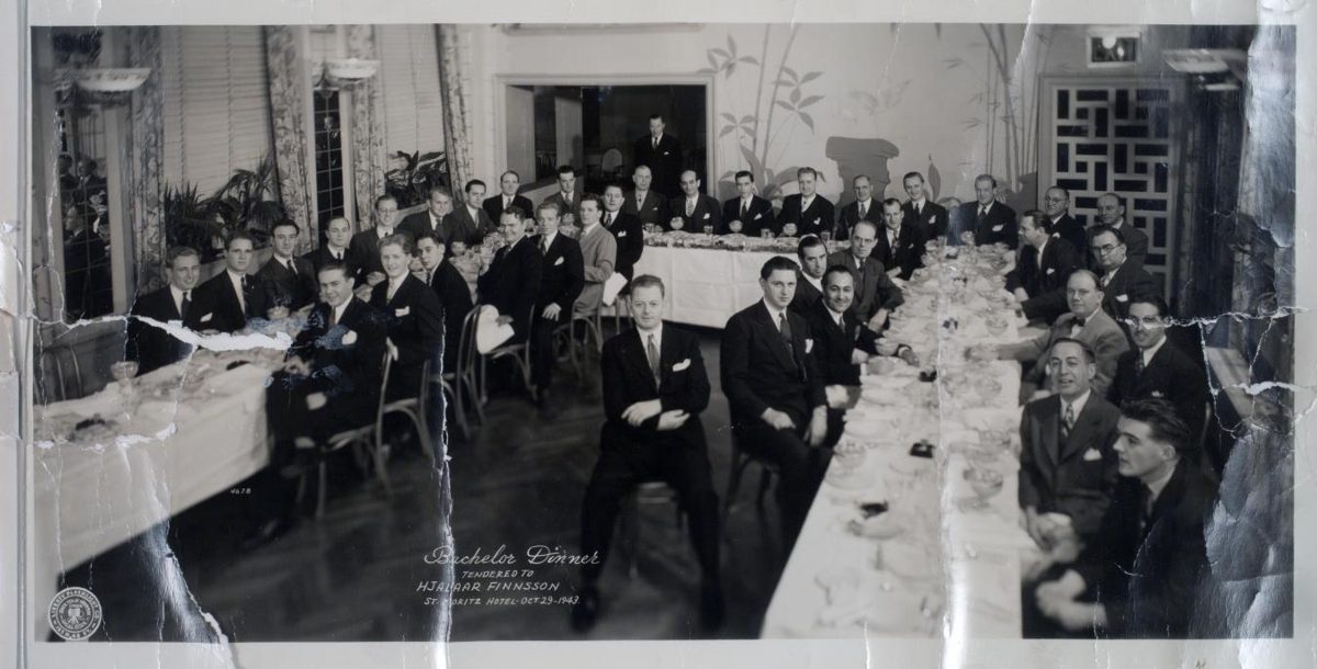 Hópur karlmanna í veislusal á hóteli. Íslendingar í New York. Á myndinni er texti: Bachelor Dinner TENDERED TO HJALAAR FINNSSON ST. MORITZ HOTEL - OCT.29-1943. Þekkja má nokkra á myndinni. Þriðji maður við vegg til vinstri er Ívar Daníelsson lyfsali, annar frá honum er Hannes Pálsson bankastjóri. Maður beint á móti Ívari er Björn Hallgrímsson framkvæmdastjóri. Á borði til hægri er Helgi Þorsteinsson framkvæmdastjóri ímeð gleraugu í innra hring og þriðji frá honum er Gunnlaugur Briem lögfræðingur. Myndin er nokkuð rifin.