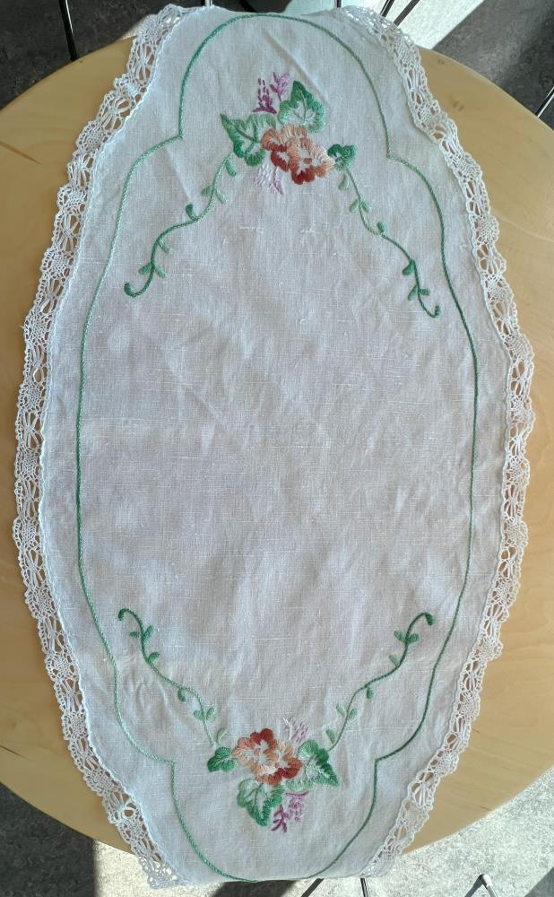 Aflangur löber, útsaumað í sínum hvorum enda með grænu og rauðsprengdu perlugarni, örlítið fjólublátt. Mislöng spor, flatsaumur of kontórstingur. Blúnda í kring
