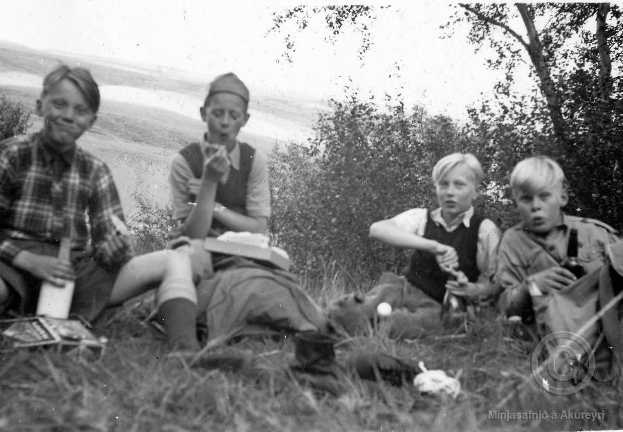 Nokkrir ungir skátar gæða sér á nesti í skátaferð. Frá vinstri, Gunnlaugur Búi Sveinsson, óþekkur, Leifur Tómasson, óþekktur.