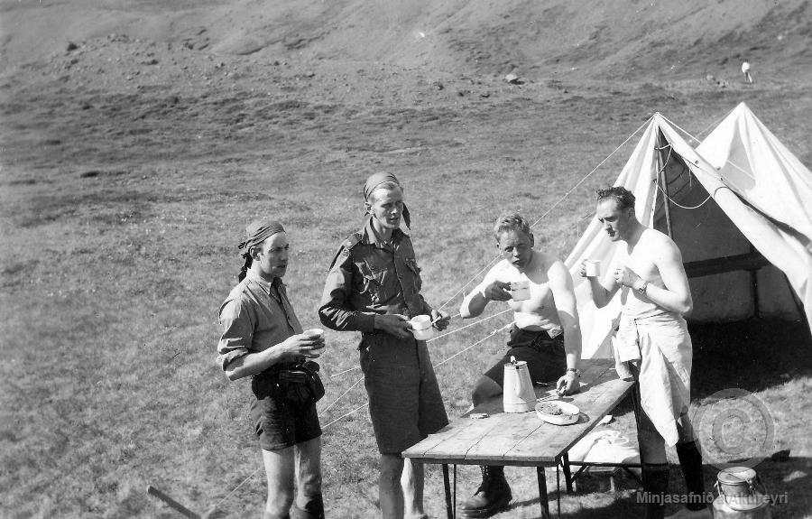 Skátar í útilegu. Fv. Kristján Hallgrímsson, Haukur Helgason, Tryggvi Þorsteinsson og óþekktur.