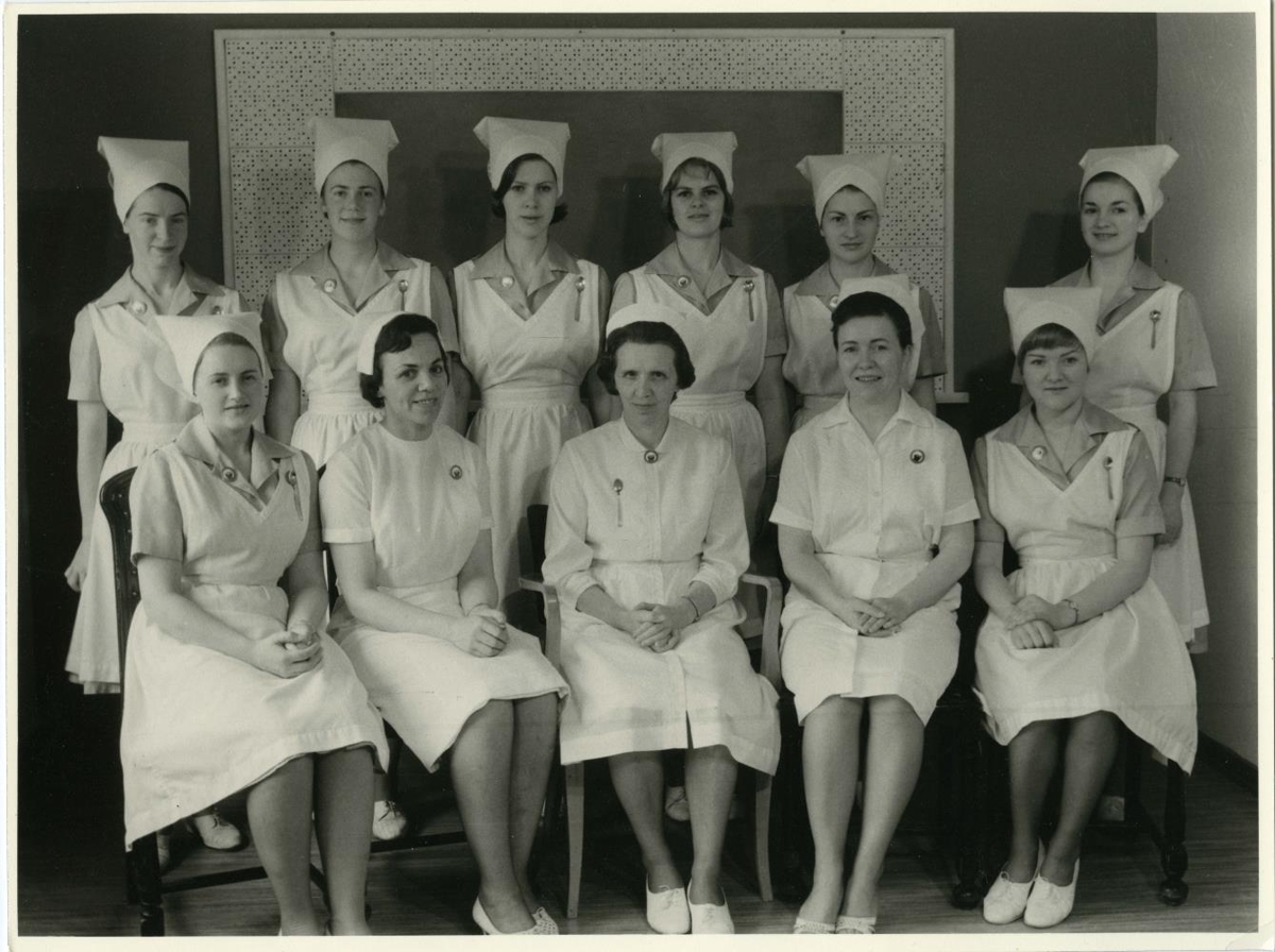 Hópmynd af nemendum og kennurum Húsmæðraskóla Íslands vorið 1964. Þrír kennarar og átta nemendur. Í fremri röð eru Bryndís Steinþórsdóttir, Vigdís Jónsdóttir og Benný Sigurðardóttir. Emelía Kofoed Hansen er þriðja frá vinstri í efri röð. Aðalbjörg Ingvarsdóttir er fyrst til hægri í fremri röð.