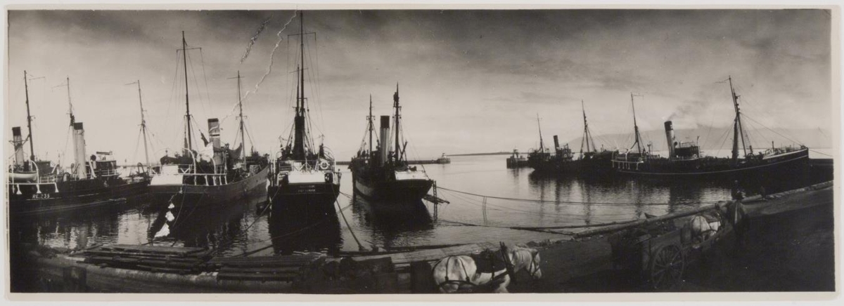 Togarar við bryggju. Gylfi RE-235, óþekktur, Njörður RE-36, óþekktur, Hilmir RE-240, Ari RE-147. Kol flutt á tveimur hestakerrum og kúskur leiðir fremri hestinn.
