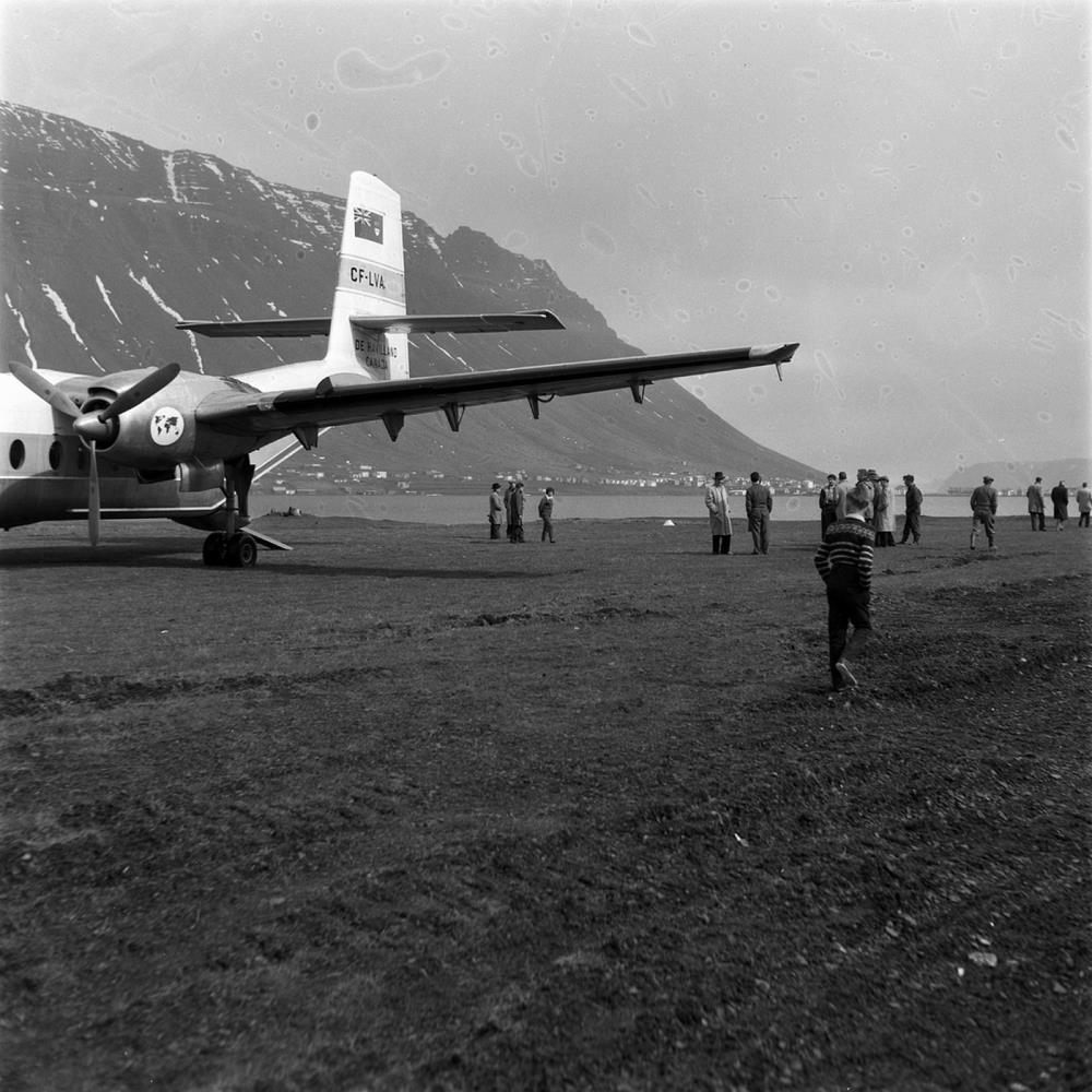 „Þessi mynd er greinilega tekin á Ísafjarðarflugvelli af de Havilland Canada, DHC-4 Caribou, sem hingað kom í sýningarflugi á vegum verksmiðjunnar.“ (SA 2025)