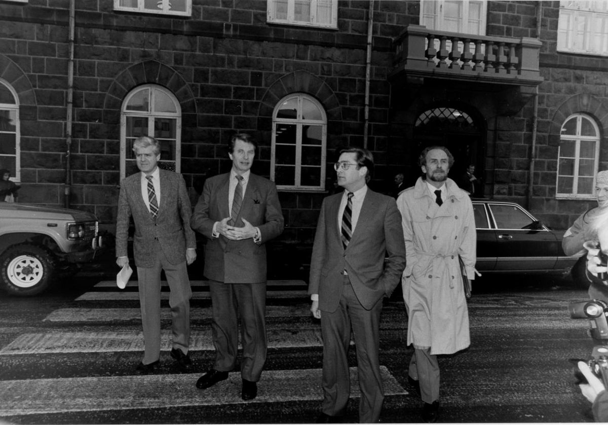 Skammdegisvaka 1986. Landssamtökin Þroskahjálp og Öryrkjabandalagið gengust fyrir Skammdegisvöku á Hótel Borg 11. desember 1986 til að mótmæla meðferð Alþingis á málefnum fatlaðra. Vakan hófst með því að safnast var saman á Austurvelli þar sem Arnþór Helgason flutti ávarp og formönnum þingflokkanna voru afhent mótmælaskjöl. Myndaröð: Ragnar Arnalds, Steingrímur Hermannsson, Þorsteinn Pálsson, Jón Baldvin Hannibalsson Formenn þingflokkanna á gangi í Kirkjustræti, Alþingishúsið í baksýn.