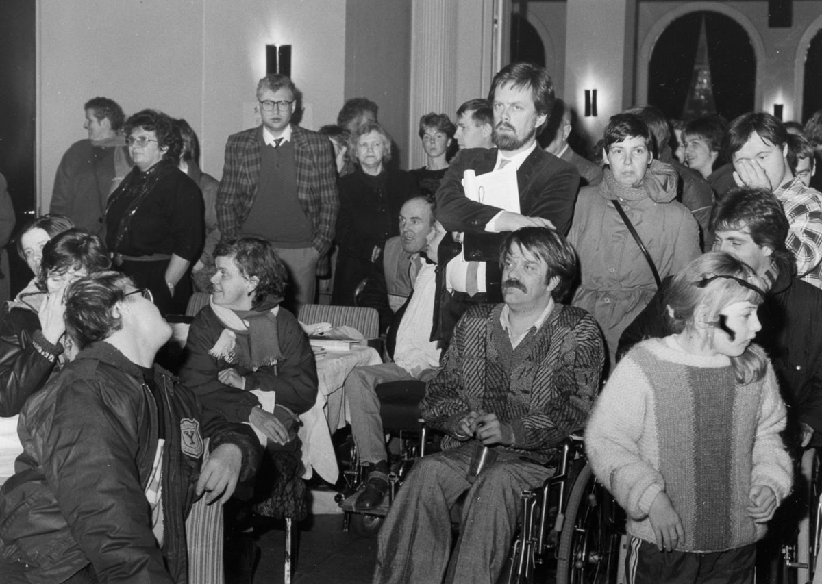 Skammdegisvaka 1986. Landssamtökin Þroskahjálp og Öryrkjabandalagið gengust fyrir Skammdegisvöku á Hótel Borg 11. desember 1986 til að mótmæla meðferð Alþingis á málefnum fatlaðra. Vakan hófst með því að safnast var saman á Austurvelli þar sem Arnþór Helgason flutti ávarp og formönnum þingflokkanna voru afhent mótmælaskjöl. Myndaröð: Ástráður Hreiðarsson, læknir, Svavar Gestsson alþingismaður, Jenna Jensdóttir, rithöfundur, ofl. Skemmtun í sal.