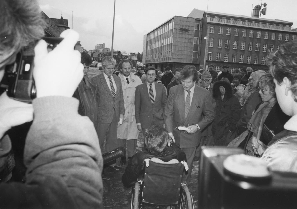 Skammdegisvaka 1986. Landssamtökin Þroskahjálp og Öryrkjabandalagið gengust fyrir Skammdegisvöku á Hótel Borg 11. desember 1986 til að mótmæla meðferð Alþingis á málefnum fatlaðra. Vakan hófst með því að safnast var saman á Austurvelli þar sem Arnþór Helgason flutti ávarp og formönnum þingflokkanna voru afhent mótmælaskjöl. Myndaröð: Ragnar Arnalds, Jón Baldvin Hannibalsson, Þorsteinn Pálsson, Steingrímur Hermannsson, Örn Ómarsson Örn Ómarsson afhendir Steingrími Hermannssyni upprúllað skjal.