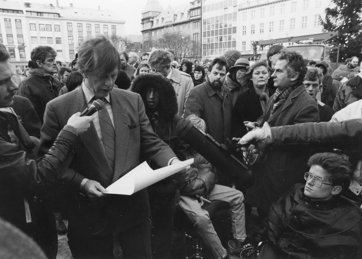 Skammdegisvaka 1986. Landssamtökin Þroskahjálp og Öryrkjabandalagið gengust fyrir Skammdegisvöku á Hótel Borg 11. desember 1986 til að mótmæla meðferð Alþingis á málefnum fatlaðra. Vakan hófst með því að safnast var saman á Austurvelli þar sem Arnþór Helgason flutti ávarp og formönnum þingflokkanna voru afhent mótmælaskjöl. Myndaröð: Steingrímur Hermannsson, ..., Örn Ómarsson. Steingrímur les skjal. Umhverfis standa mótmælendur.