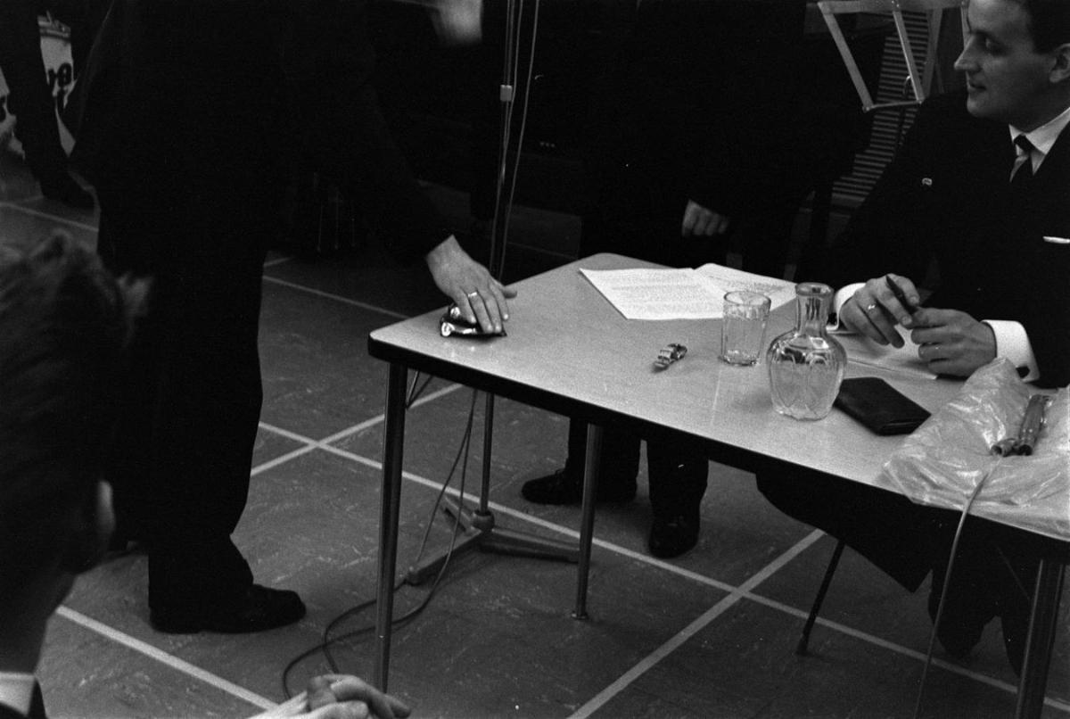 Útvarpsþáttur Svavars Gests var afar vinsæll en hann var sendur beint úr útvarpssal við Skúlagötu. Með honum á einni myndinni er annar frægur útvarpsmaður Jónas Jónasson. Í bakgrunni má sjá í hljómsveit SG og m.a. Eyþór Þorláksson gítarleikara. Gestir í sal voru prúðbúnir í þá daga.