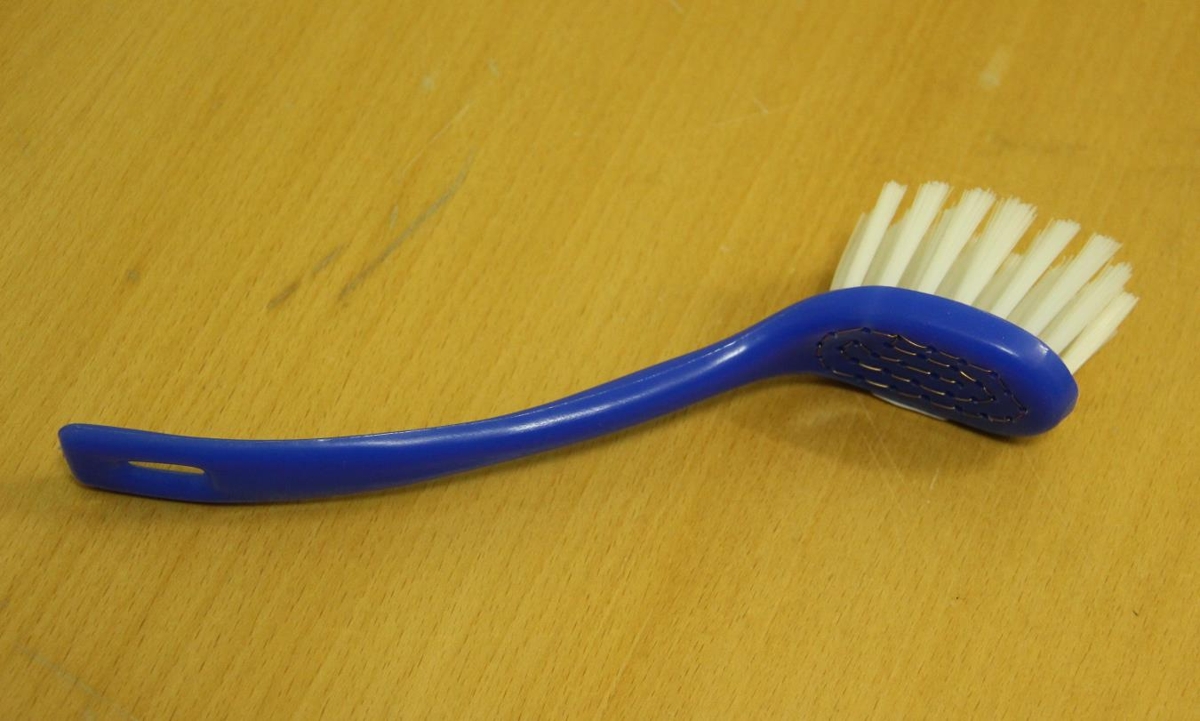 Uppþvottaburstinn er blár með hvítum nælonhárum.