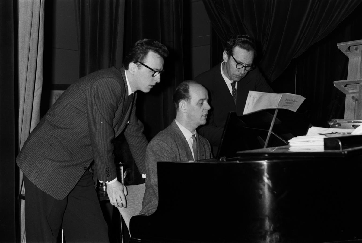 „Þetta eru frá vinstri Reynir Oddsson, Gunnar Jónsson píanóleikari og Egill Bjarnason þýðandi við æfingar á söngleik í Framsóknarhúsinu við Fríkirkjuveg er seinna varð Glaumbær.“ (RO 2021)