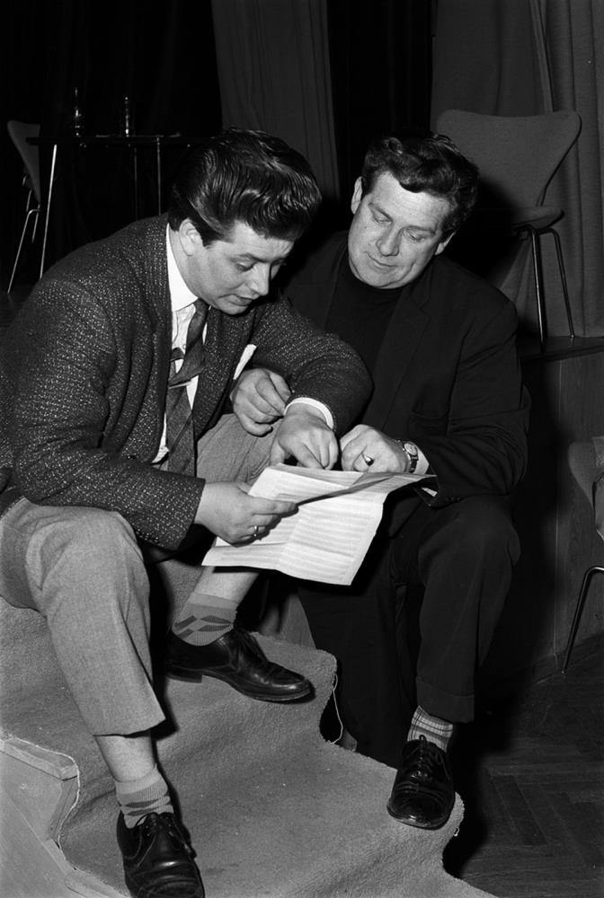 „Þetta eru frá vinstri Jón Gunnlaugsson og Birgir Halldórsson, leikarar og söngvara á æfingu í þýskum söngleik í Framsóknahúsinu 1960. Reynir Oddsson var stjórnandi. Söngleikur þessi komst aldre á svið vegna fjárhagsvandræða o.fl.“ (RO 2021)