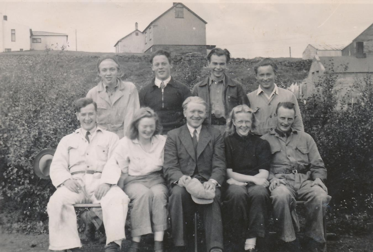 Mynd af nemendum Garðyrkjuskóla Ríkisins sem unnu að steinhæði í Skallagrímsgarði sumarið 1945 og fl. Talið f.v., efri röð: Hjalti O. E. Jakobsson, Theodór Halldórsson, Bjarni Helgason, Ólafur Þórðarson, Baldur Gunnarsson, Viktoría Skúladóttir, Unnsteinn Ólafsson (skólastjóri), Ragna Hermannsdóttir og Gísli Jóhannsson.