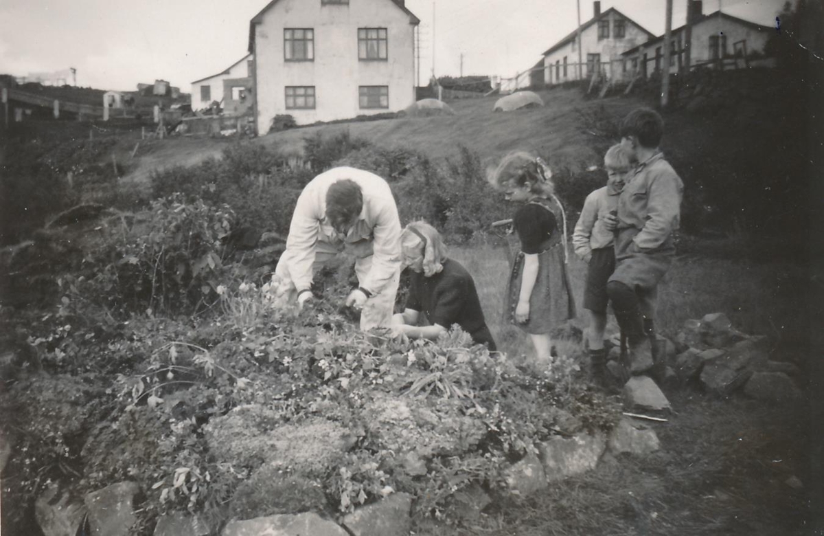 Baldur Gunnarsson og Ragna Hermannsdóttir leggja lokahönd á steinhæðina í Skallagrímsgarði undir áhugasömum augum ungra Borgfirskra barna. Borgarbraut 25 sést í bakgrunni.