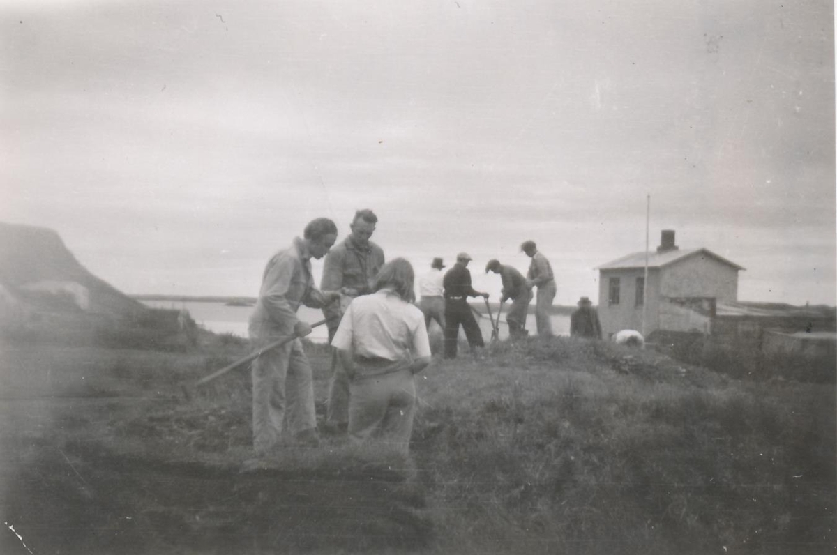 Nemendur Garðyrkjuskóla ríkisins að vinnu í Skallagrímsgarði 1945. Í forgrunni má sjá Viktoríu Skúladóttur, Hjalta O. E. Jakobsson og Gísla Jóhannsson vinna.