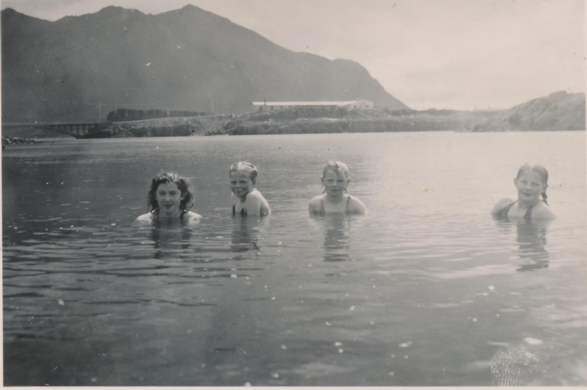 Sjósund við Kaupfélagsfjöruna (Englendingavík) með Stóru og Litlu Brákarey í baksýn. Kristín Jónasdóttir, Edda kristjánsdóttir og systurnar Elísabet (Ella) og Ólöf (Lalla) Sigurðardætur