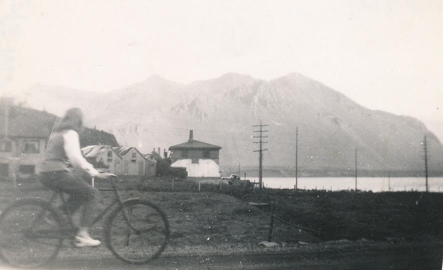 Kona fer niður Borgarbrautina á reiðhjóli. Í baksýn er Hafnarfjall og húsin Borgarbraut 16 (Hlíðarendi) og Berugata 10. Myndin er tekin fyrir utan innganginn á Skallagrímsgarði.