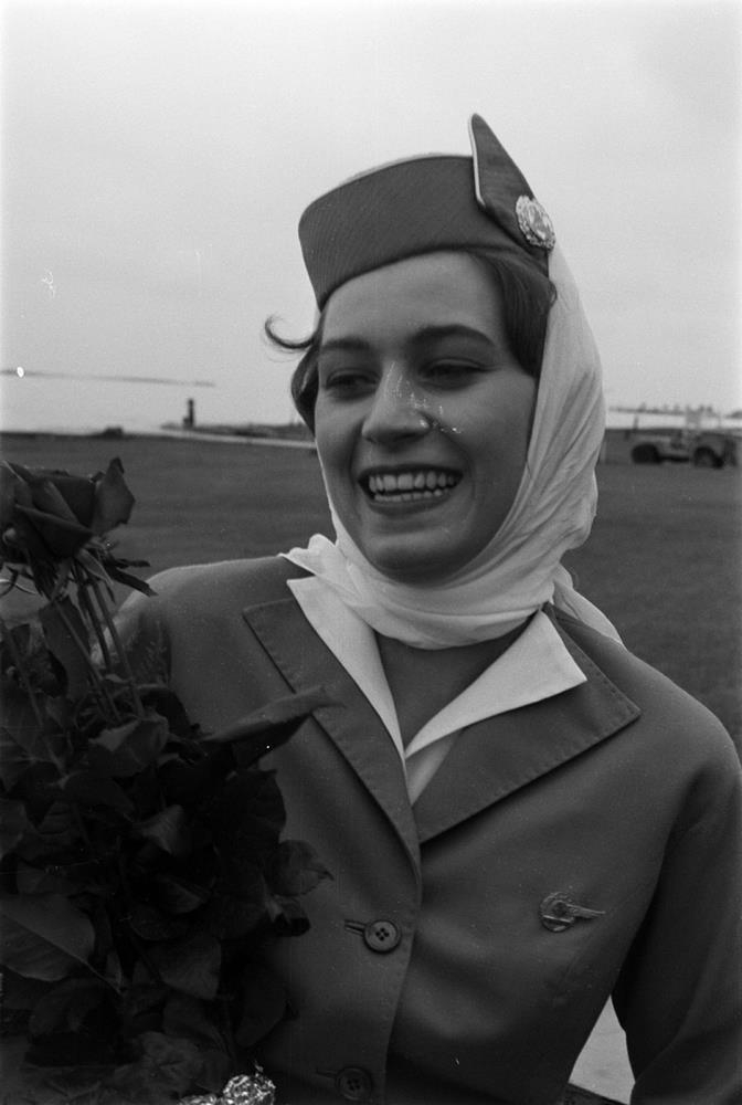 Það þótti mikill viðburður þegar Pan American þotur komu til Keflavíkur í áætlunarflugi. Þá störfuðu 2 íslenskar flugfreyjur hjá félaginu og eru þessar myndir af þeim. Á hópmyndinni eru sennilega foreldrar þeirra. Þetta var fyrsta flug Pan Am hingað.