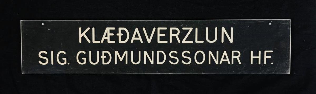Glært plexí skilti með áletrun : Klæðaverzlun Sig. Guðmundssonar HF.