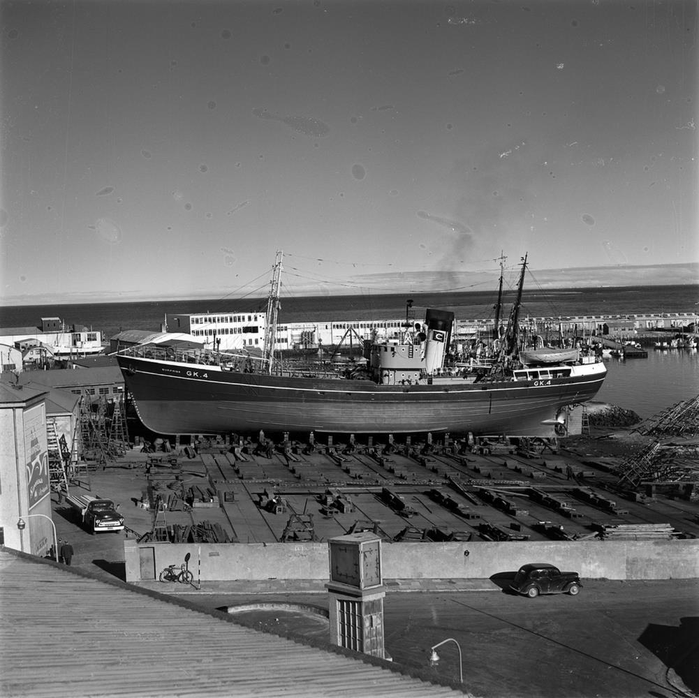 Síðutogarinn Surprise frá Hafnarfirði eftir að hafa verið botnhreinsaður og málaður í Slippnum við Mýrargötu. Ég tók eflaust þessar myndir fyrir föður minn sem var skrifstofustjóri Slippfélagsins í Reykjavík hf í tæp 40 ár.