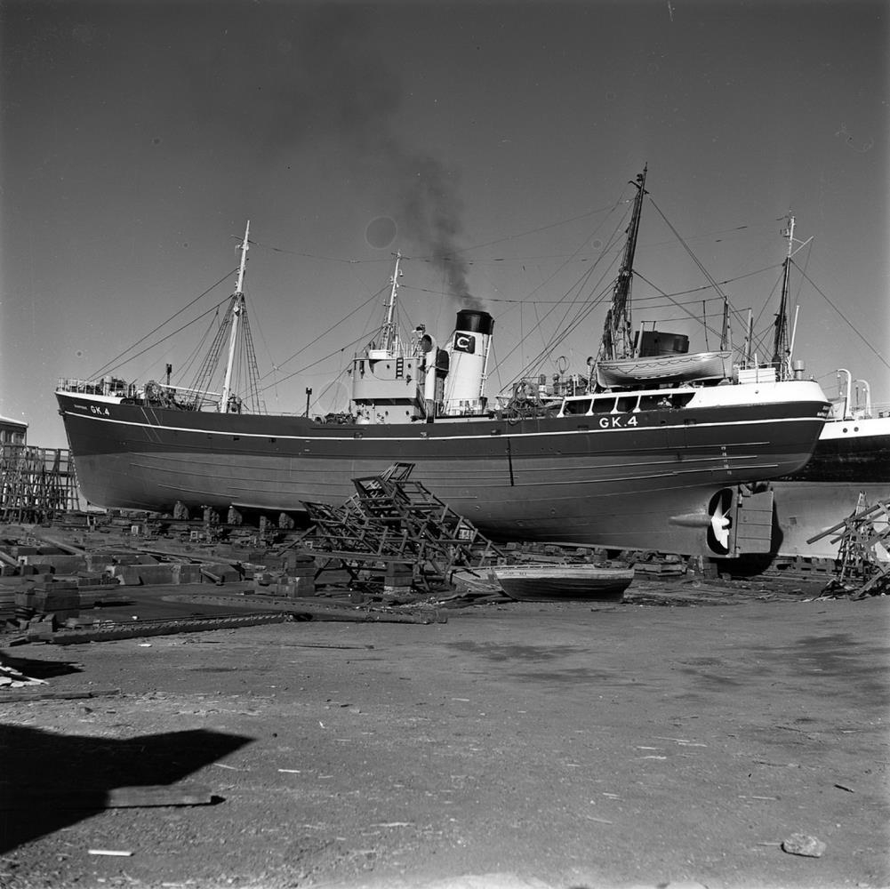 Síðutogarinn Surprise frá Hafnarfirði eftir að hafa verið botnhreinsaður og málaður í Slippnum við Mýrargötu. Ég tók eflaust þessar myndir fyrir föður minn sem var skrifstofustjóri Slippfélagsins í Reykjavík hf í tæp 40 ár.