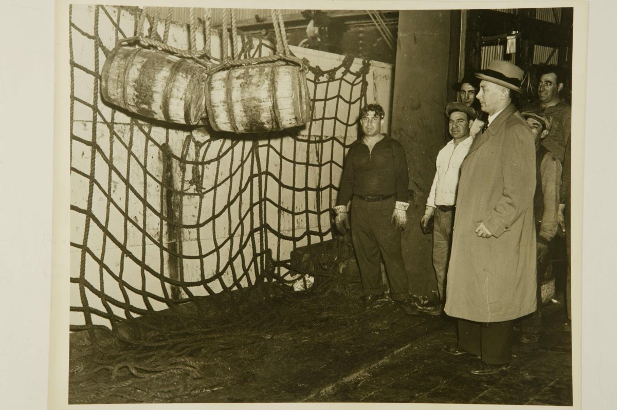 Net með tveimur síldartunnum hangandi. Verkamaður stendur hjá og karlmaður klæddur í frakka með hatt. Vilhjálmur Þór fremst.