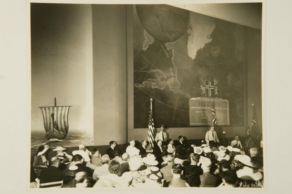 Maður að halda fyrirlestur í sal með fjölda fólks. Að baki honum er stórt landakort sem sýnir Ameríku, Grænland og Ísland. Einkennisklæddir menn með bandaríska og íslenska fánann til beggja hliða við fyrirlesarann. Til hliðar er mynd af víkingaskipi á siglingu undir fullum seglum. Fyrirlestur haldinn í tengslum við heimsýninguna 1939.