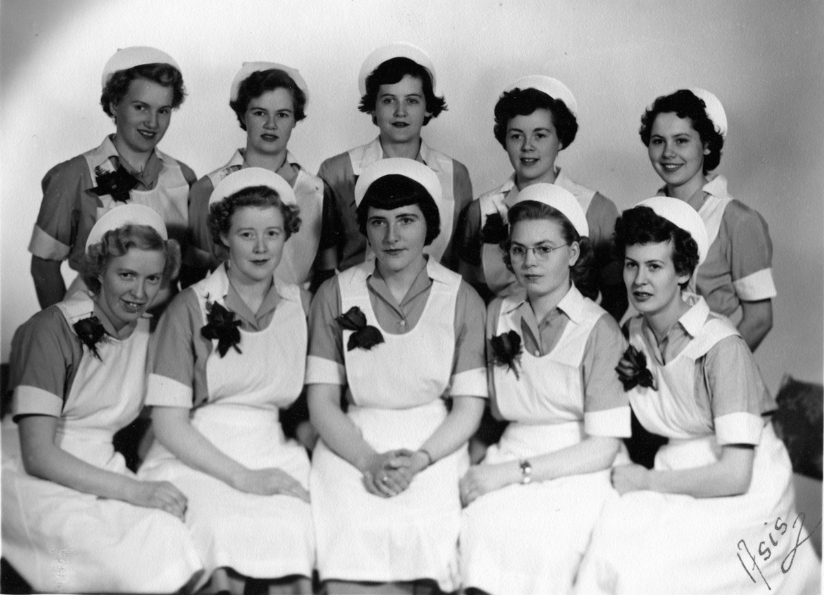 Útskriftarhópur frá Hjúkrunarkvennaskóla Íslands haust 1953. 10 ERU Á mynd 14 luku námi en 4 eru skráðar með vorhóp.