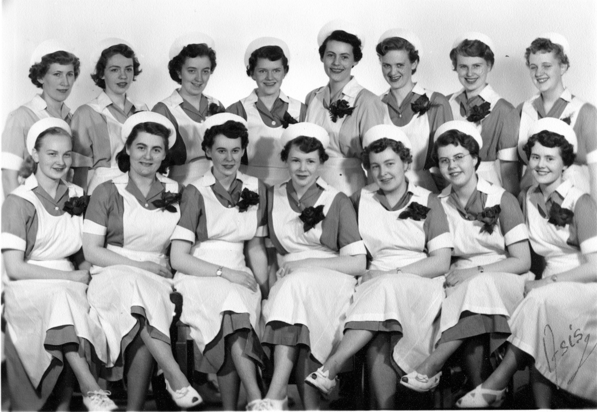 Útskriftarhópur frá Hjúkrunarkvennaskóla Íslands haust 1954. 15 á mynd 12 luku í okt en 3 fyrri hluta 1955