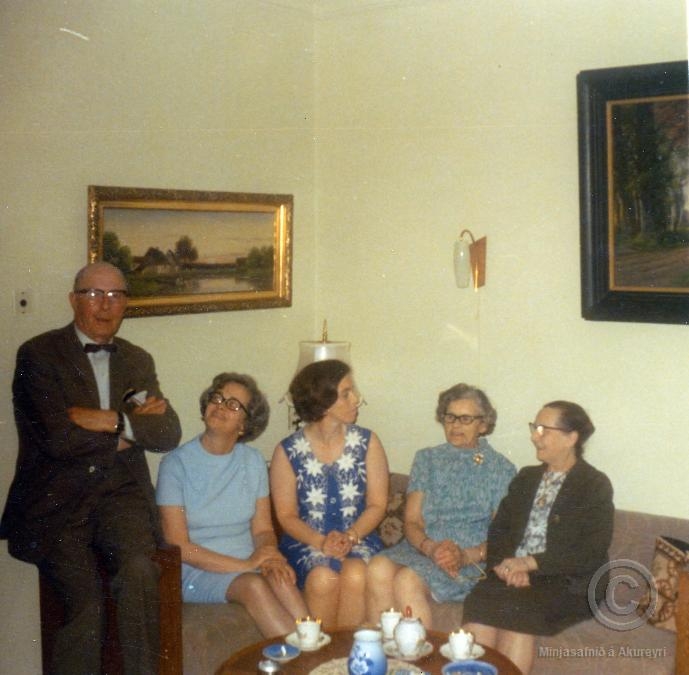Kaffiboð í stofu í heimahúsi líklega á Akureyri. Mávastellið hefur verið dregið fram af þessu tilefni.