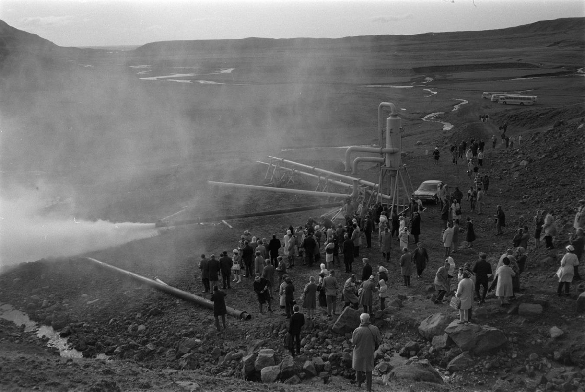 Gufugos úr borholu ofan við Hveragerði. Fólkið fylgist með.