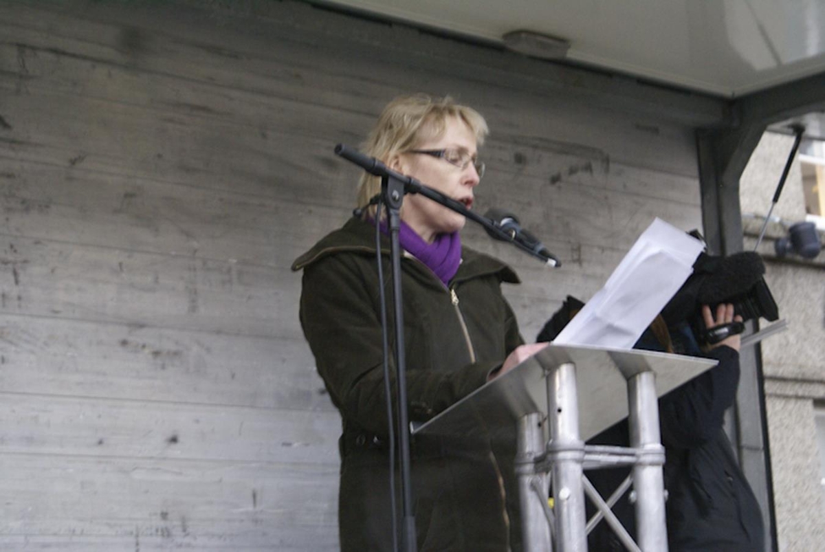 Kona að halda ræðu af palli flutningabíls.