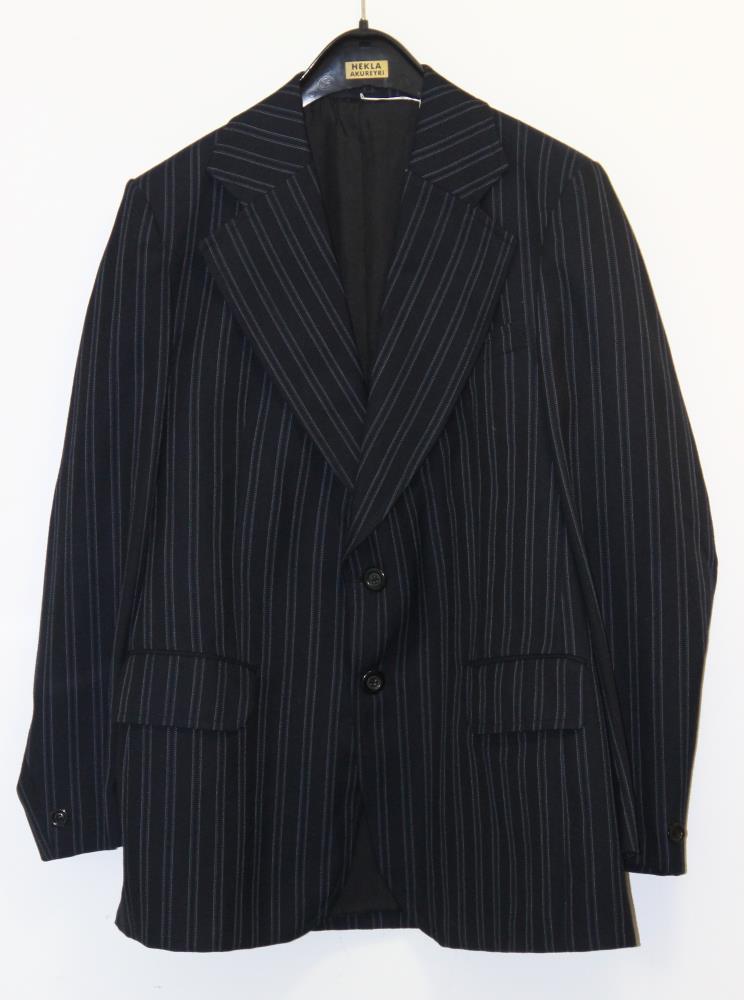 Ullarjakki á herra. Hann er dökkblár, teinóttur og tvíhnepptur.
