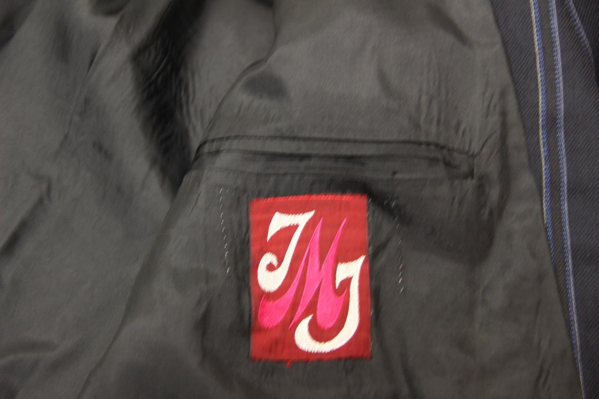 Ullarjakki á herra. Hann er dökkblár, teinóttur og tvíhnepptur.