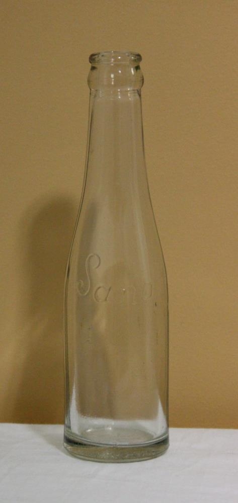 Glær glerflaska með upphleyptu "Sana" merki á glerinu.