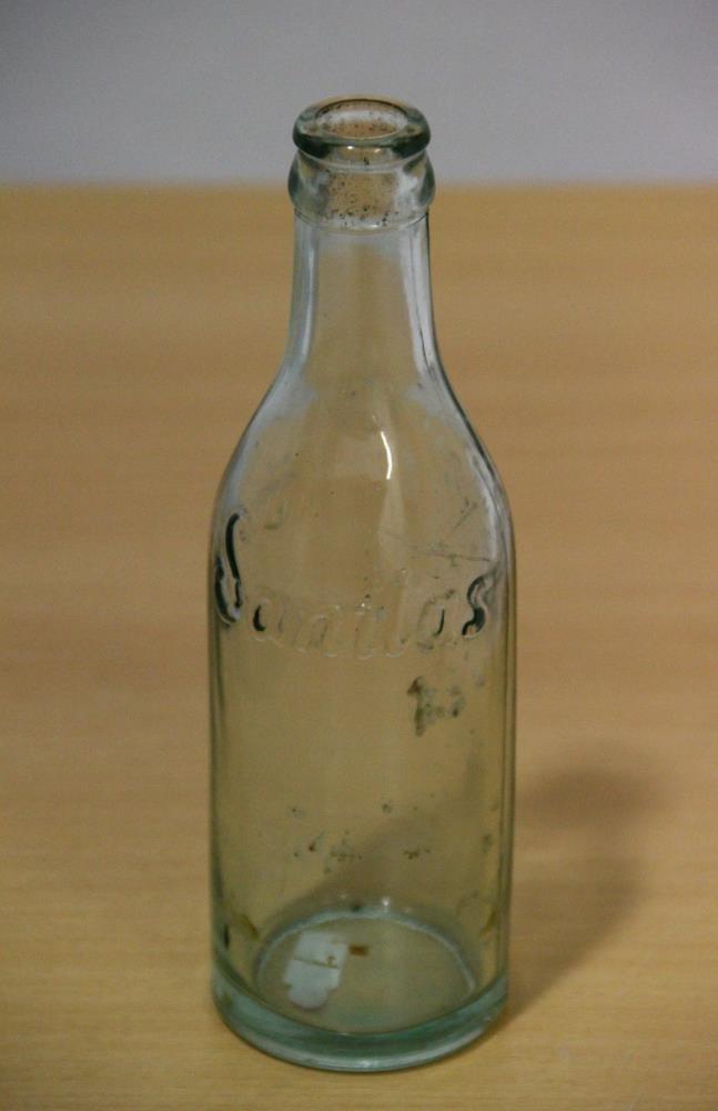 Glær gosflaska með upphleyptu letri: Sanitas. Örlitlar leifar af álímdum miða, Þarna hefur staðið: Límonaði. Nánast horfið.