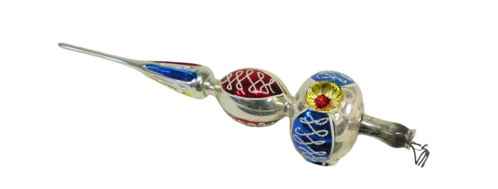 Jólaskraut. Toppur á jólatré. Silfurlitaður í grunninn með gullt, rautt, blátt og hvítt munstur. Formið af toppnum er í þrem lögum.
