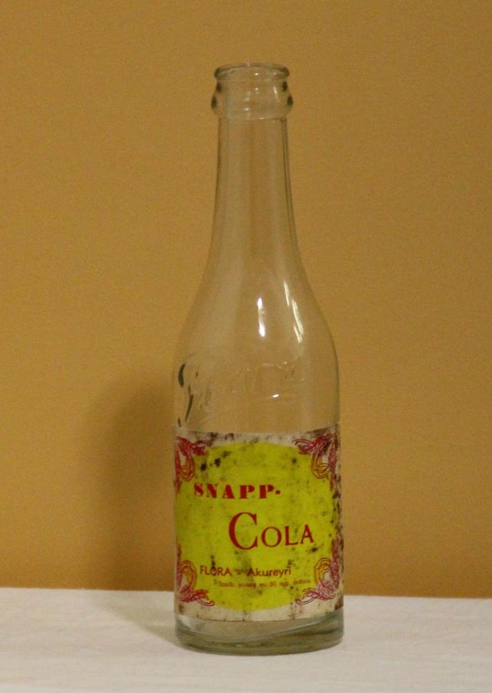 Flaskan er glær með upphleyptu letri: Flóra. Áletrun á álímdum miða, gulum í grunninn með rauðu letri. Texti: Snapp-cola - Flóra Akureyri.