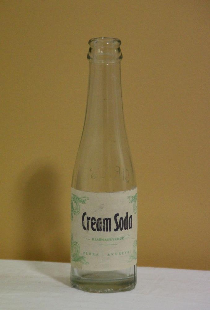 Flaskan er glær með upphleyptu letri og merki: Síríus, og stjarna. Áletrun á álímdum miða, hvítum í grunninn, með svörtu og grænu letri. Texti: Cream soda - Flóra Akureyri.