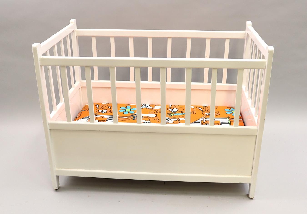 Hvítmálað rimlarúm með flötum rimlum . Botnin er úr spónaplötu hugsanlega seinna tilkomin. Dýna fylgir rúminu; appelsínugul með myndum af kanínum, húsi og blómum m.a.