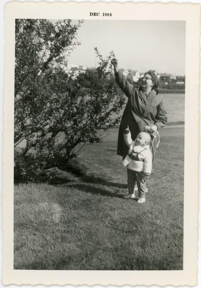 Lilja Sturlaugsdóttir frá Fjósum í Laxárdal og Elísabet Ingólfsdóttir (dótturdóttir Kristjáns bróður hennar) við Reykjavíkurtjörn.