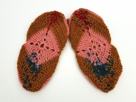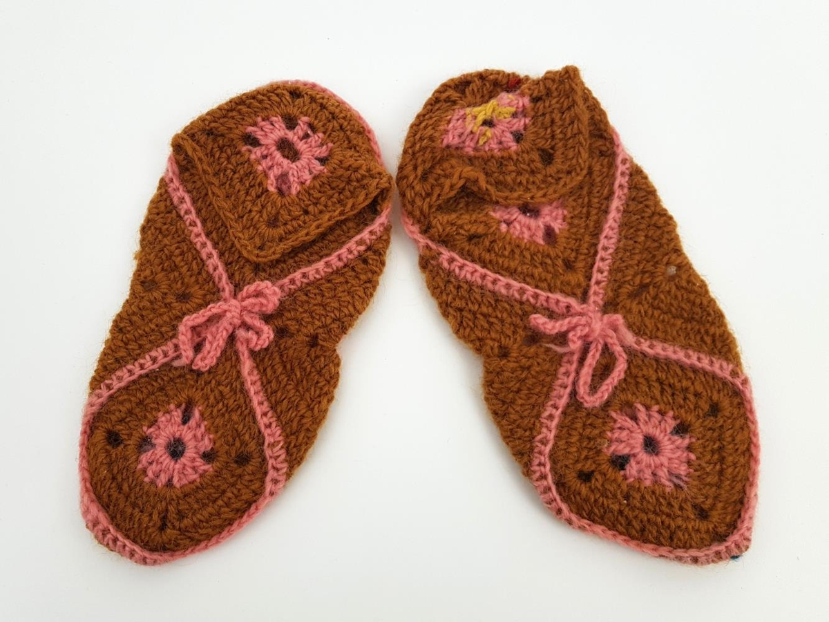 Inniskórnir eru ekki ólíkir sokkum en með hekluðum kanti við ökkla. Framan