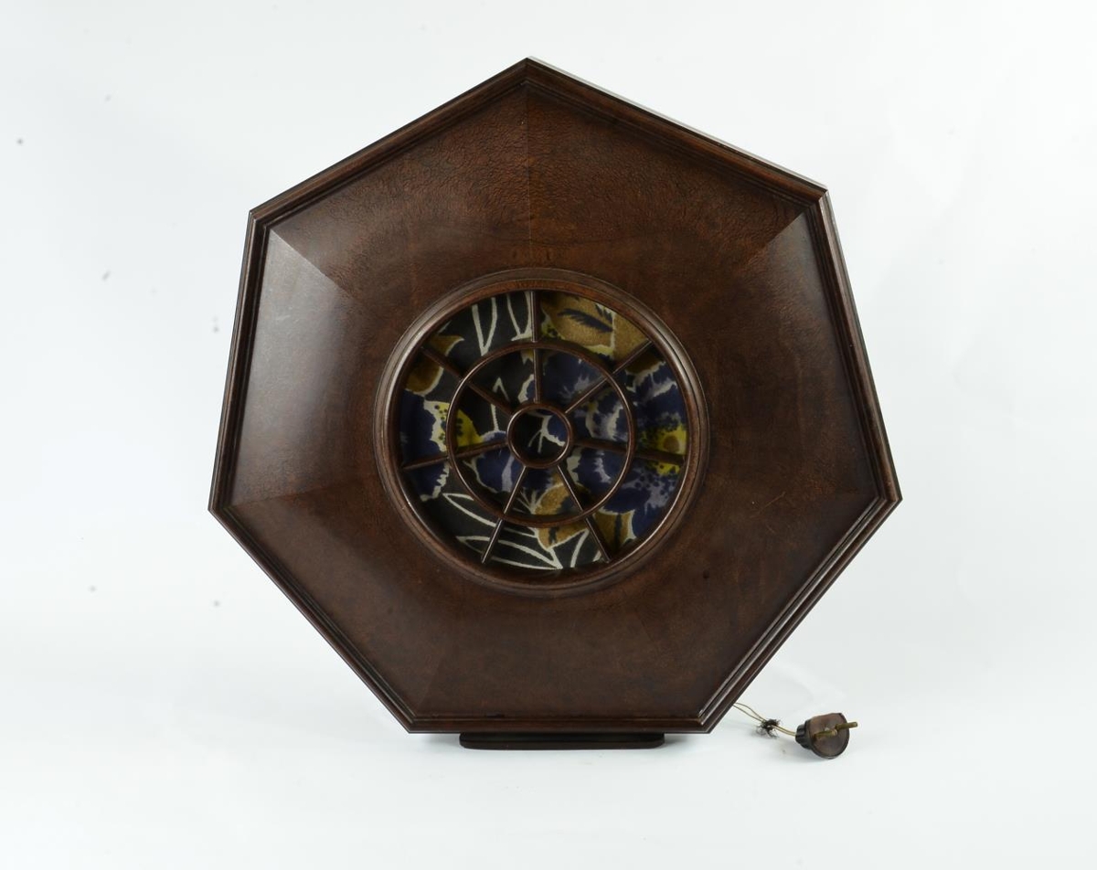 Brúnn hátalari, sjöhyrningslaga. Miðja hátalarans er hringlaga og þar fyrir innan er dökklitað efni með fjólubláu/brúnu blóma/laufblaðamynstri. Hátalarinn kom af háaloftinu hjá Sigurði Gunnlaugssyni fyrrum bæjarritara, Hlíðarvegi, Siglufirði.