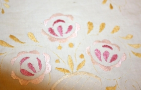 Lítill gulur löber, sem saumað er í bleik blóm.