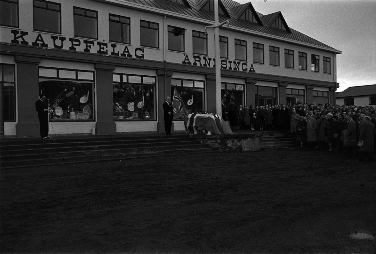 Útför Egils Thorarensens þann 21 janúar 1961. Líkkista, sveipuð íslenska fánanum stendur á tröppum Kaupfélags Árnesinga. Tveir karlmenn með fána standa sitt hvoru megin við kistuna. Karlmaður talar í hljóðnema. Mikill mannfjöldi.
