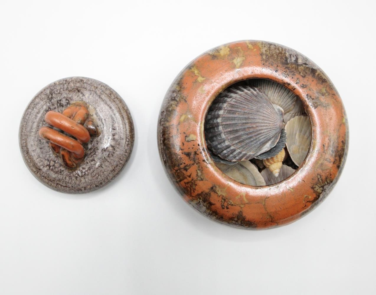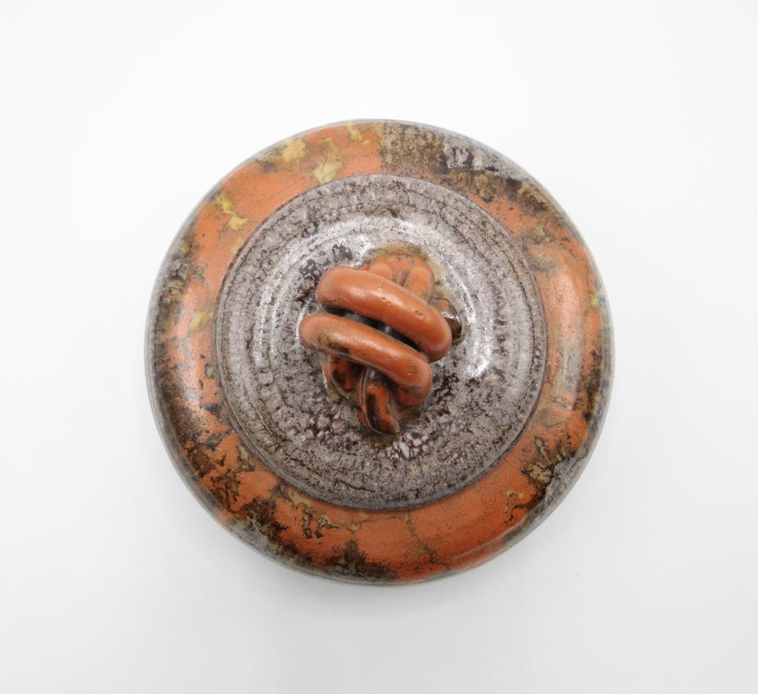 Leirkrús með loki. Glerungur er brúnyrjóttur og appelsínugulur.