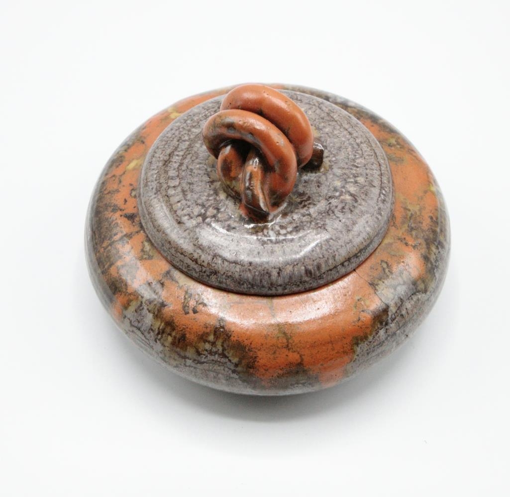 Leirkrús með loki. Glerungur er brúnyrjóttur og appelsínugulur.