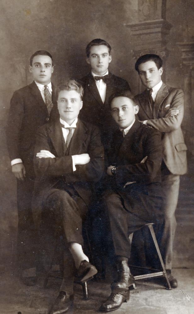 Mynd af fimm ungum mönnum, sem líklegast voru saman í söngnámi í Dresden í Þýskalandi um 1922-4. Aftan á póstkortinu stendur: "Í miðið G Kristjánsson, honum til hægri h. C. albano frá Napoli, til vinstri Stellas [?] Minalo sitjandi til hægri - Dr. Karl Wille [?] frá Leipzig, sitjandi til vinstri Professor Kristleifsson." Guðmundur Kristjánsson og Þórður Kristleifsson voru báðir úr Borgarfirðinum og lærðu söng saman.