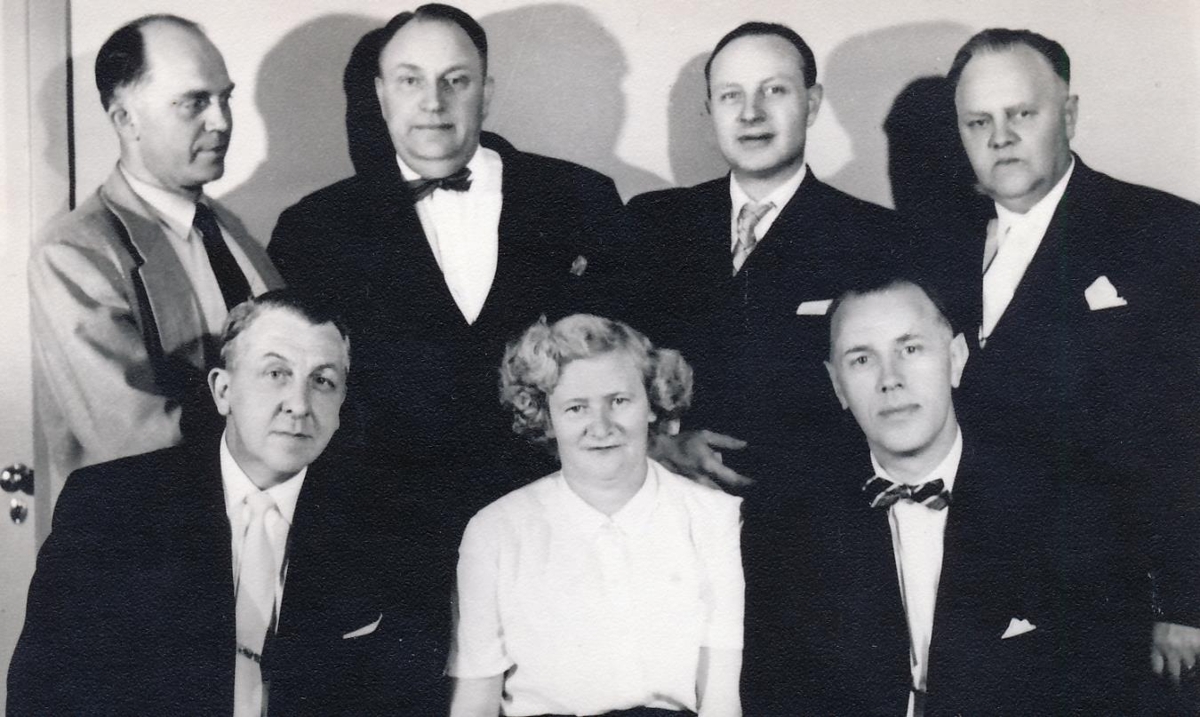 Mynd tekin við 25 ára stúdentsafmæli árgangsins sem útsrkifaðist vorið 1932 úr MA. Erfitt er að sjá hverjir hinna eru sömu ungu menn og eru á mynd 173 í sama safni, en Karl Ísfeld og Kristín Þorláksdóttir eru í hópum.