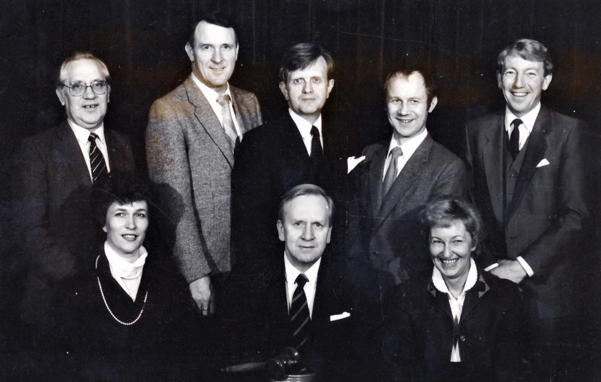 Stjórn Sjálfstæðisfélagsins í Háaleitishverfi 1983. Sitjandi: Helga Jóhannsdóttir, Ásgeir Hallsson, formaður, Stella Magnúsdóttir, gjaldkeri. Standandi f.v. Gunnar Guðmundsson, Hilmar Guðlaugsson, Einar Karlsson, ritari, Grímur Brandsson og Erik Hakonsson, varaformaður.